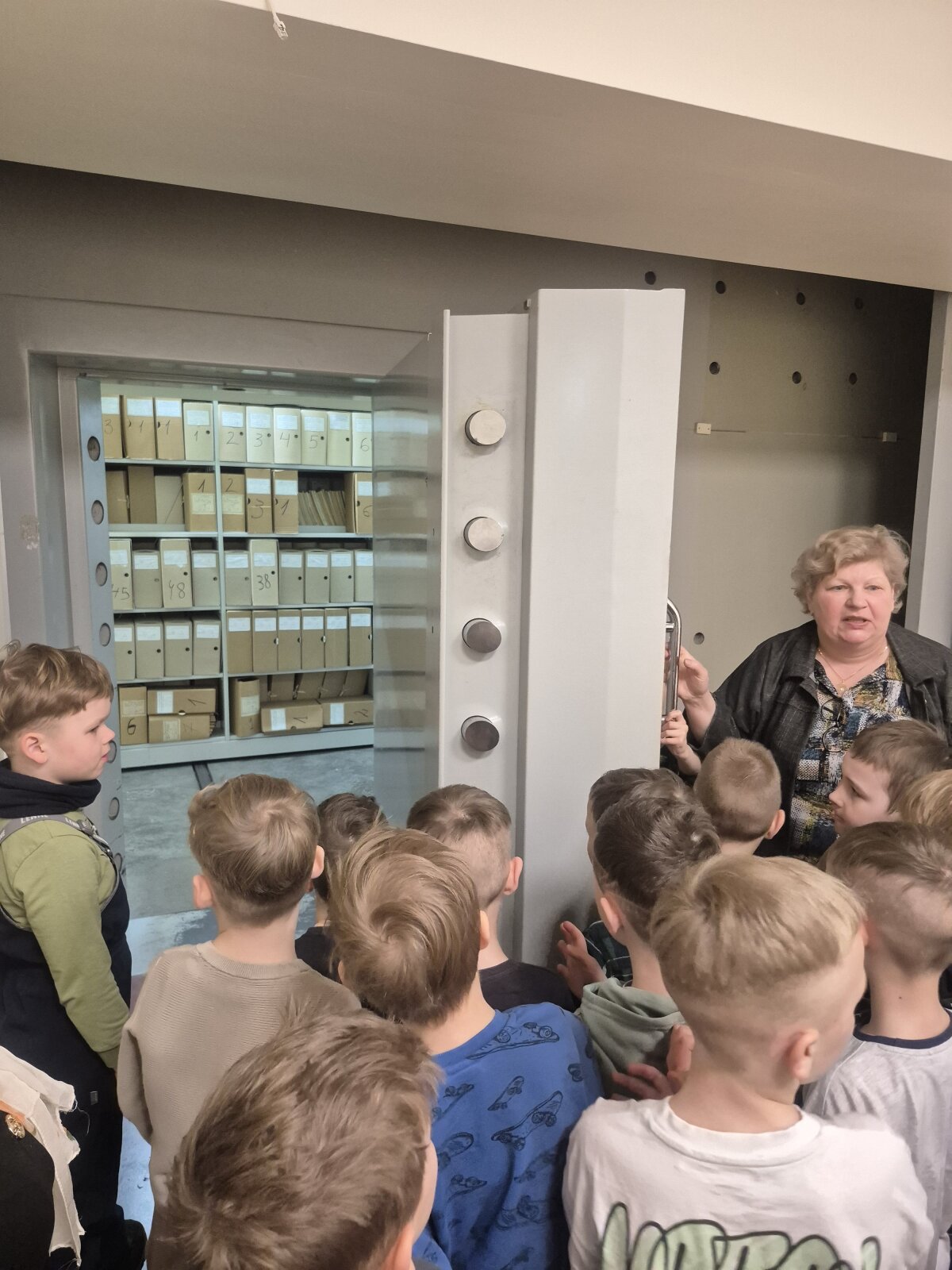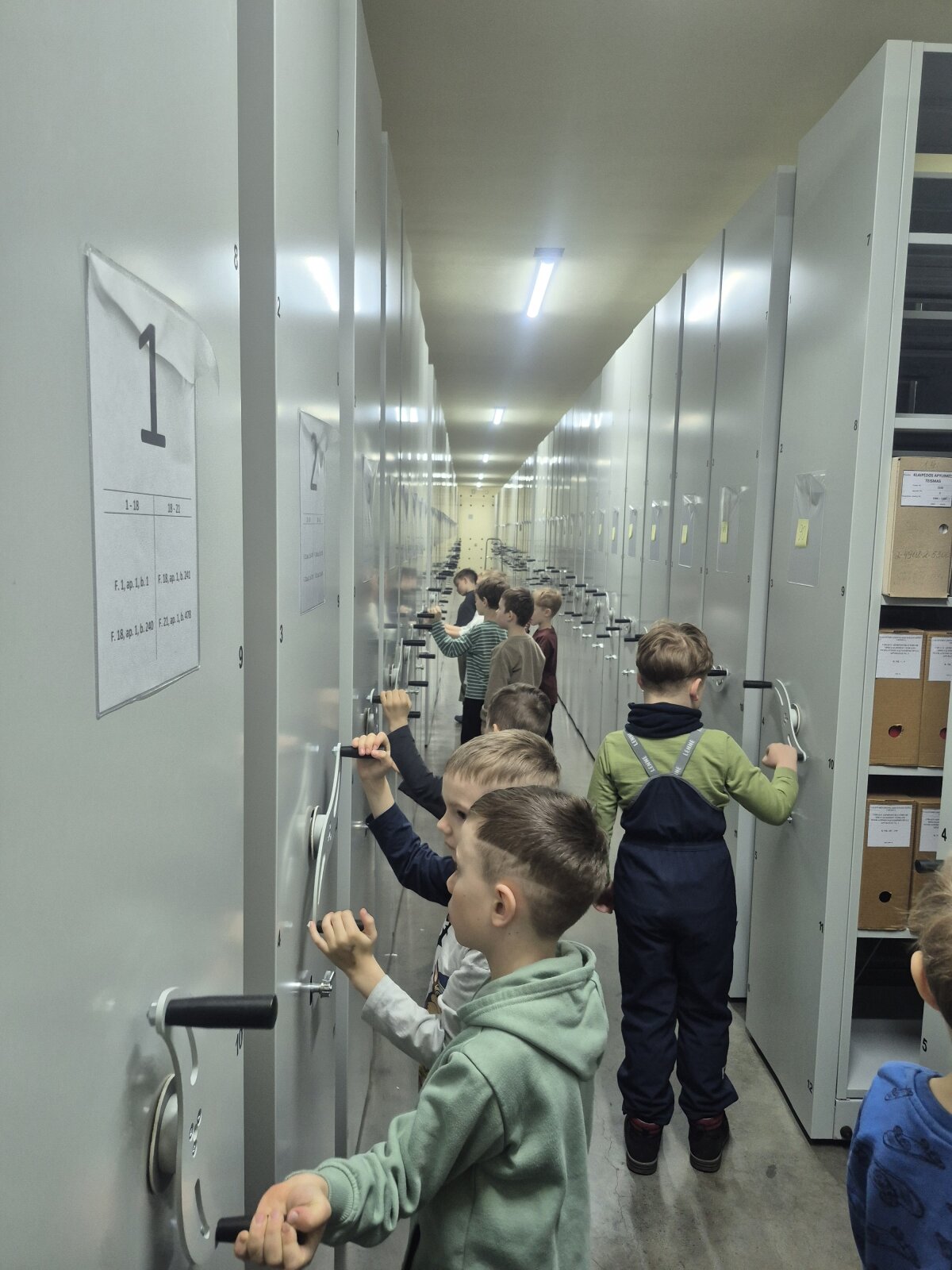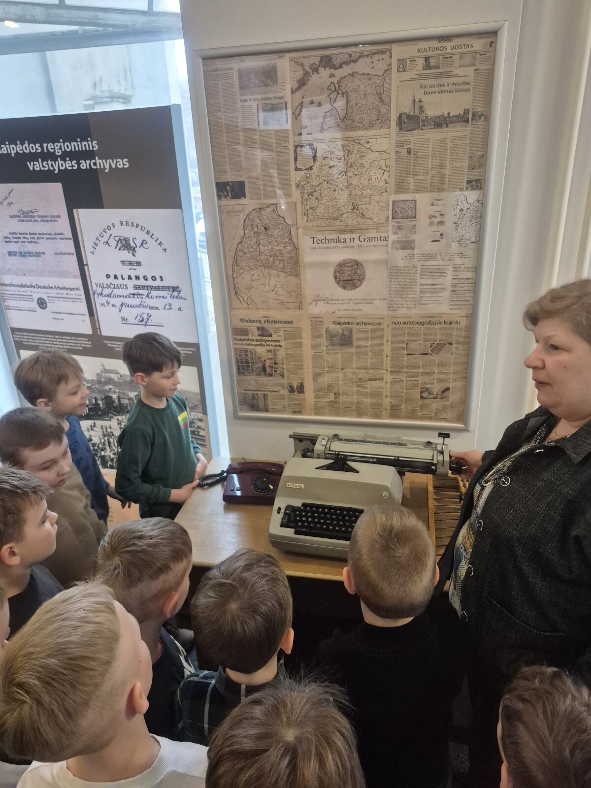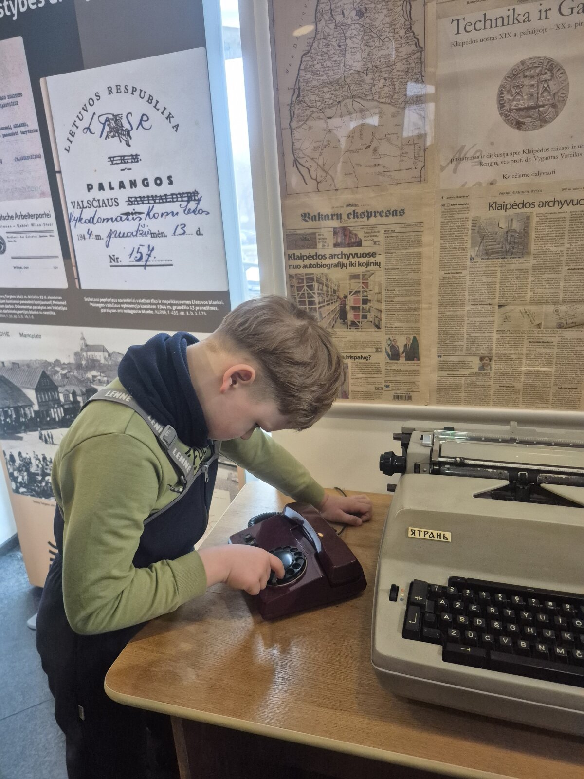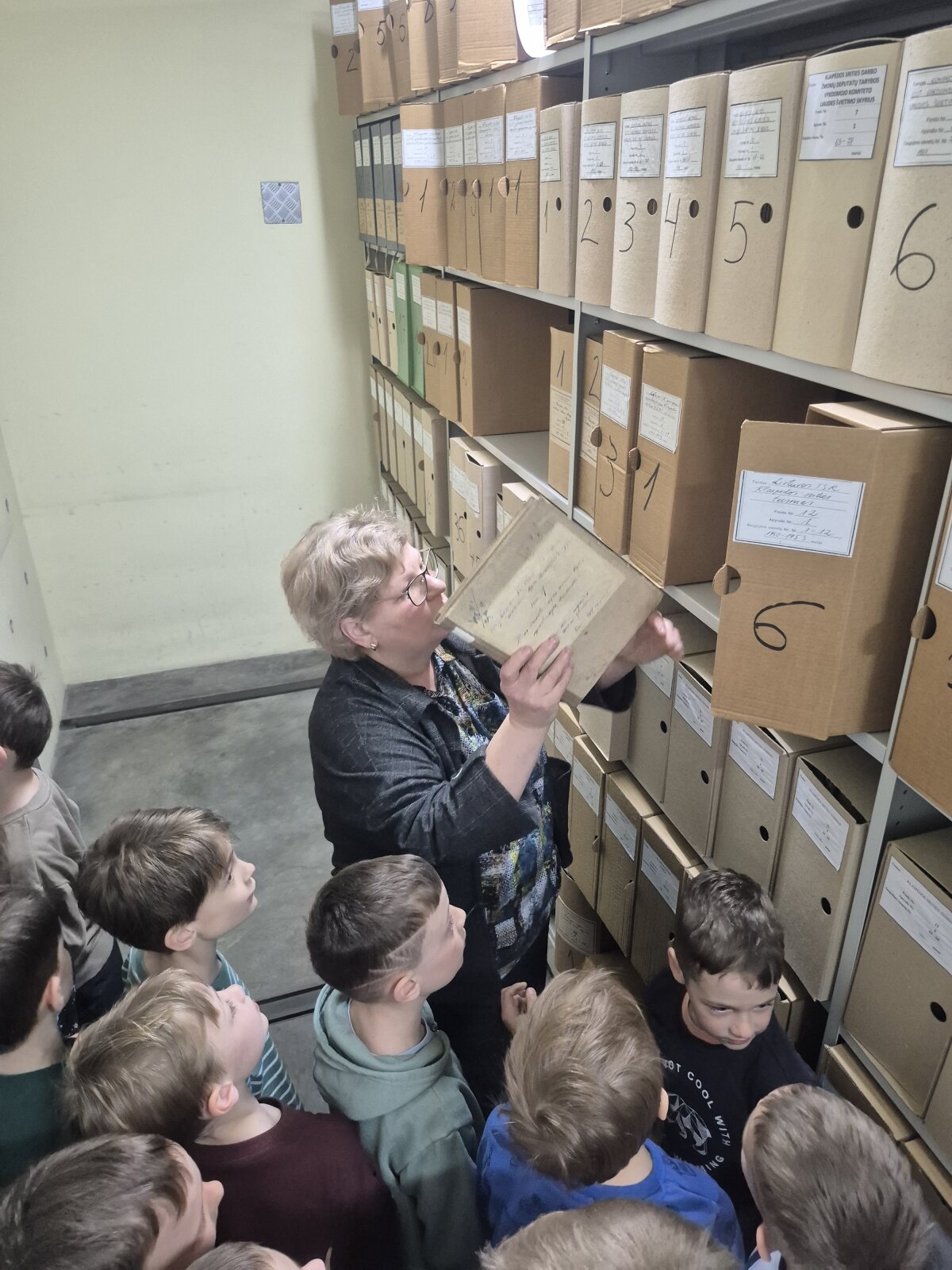 Dėkojame Bernardo mamai už pakvietimą į savo darbovietę, kur vaikai interaktyviai susipažino su archyvu, jo vykdoma veikla, bei funkcijomis. Susipažino su dokumento rūšimis, bei turėjo galimybę pamatyti seniausią, saugomą 120-ies metų archyvo dokumentą. Pamatė ir išbandė senuosius prietaisus, kurie buvo naudojami archyve (spausdinimo mašinėlę, medinius skaičiuotuvus, laidinį telefoną...). Pasimatavo archyvo direktoriaus kėdę. O pasivaikščioję archyvo tuneliais vizitą užbaigė (maždaug prieš 60 metų ) filmuotu trumpametražiu filmuku apie vaikų stovyklą, bei Senąją Klaipėdą... Vaikai šia edukacija buvo sužavėti, nes pamatė ir sužinojo naujų dalykų, o emocijomis ir įspūdžiais dalinosi grįžę su tėveliais.